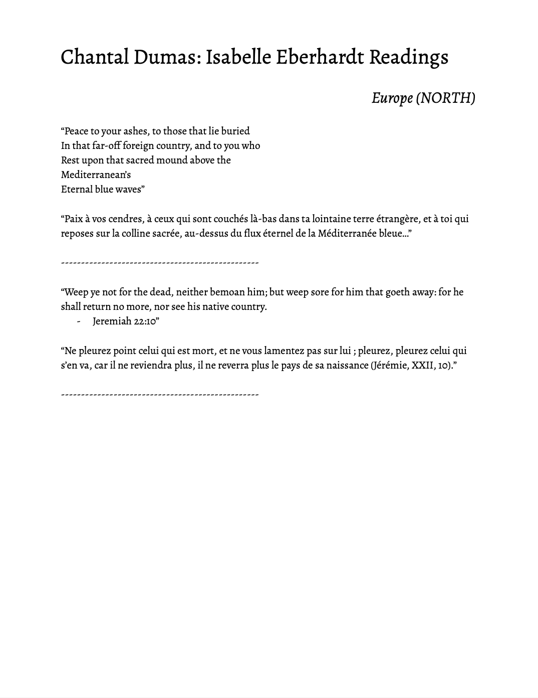 Isabelle Eberhardt readings for Chantal Dumas to record